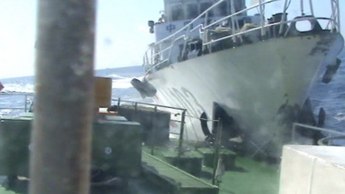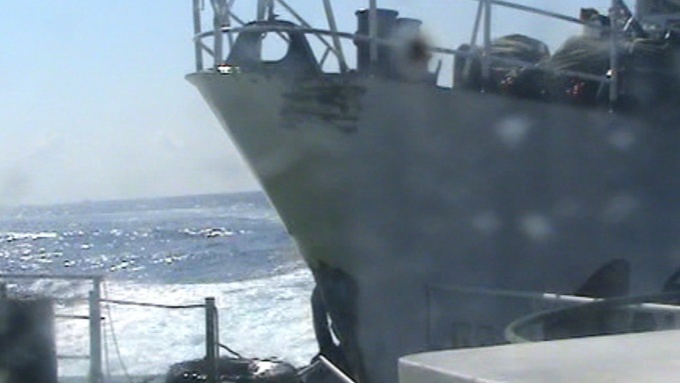 Mũi tàu Hải cảnh Trung Quốc đâm thẳng tàu Cảnh sát biển Việt Nam. Nguồn: Cảnh sát biển VN. |