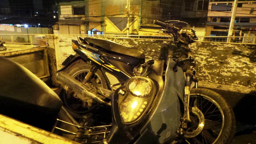 | Phần đầu taxi vỡ toang, hai xe máy bị tông nát nhiều phần. Trên mặt cầu vương vãi rất nhiều mảnh vỡ của cả ba xe. |