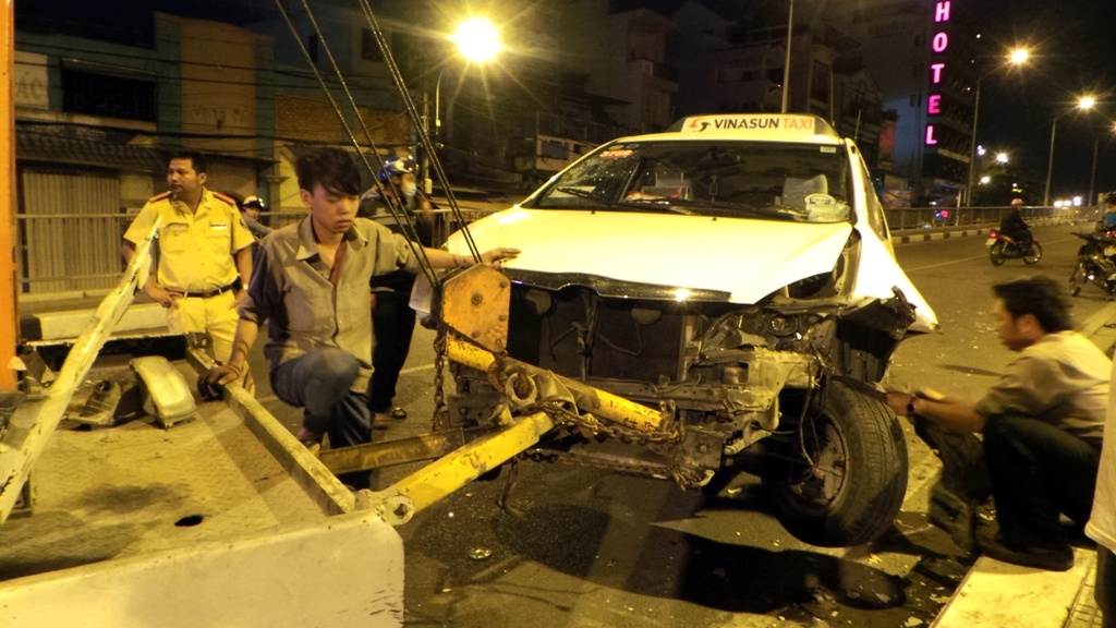 | Đến rạng sáng ngày 7/12, lực lượng CSGT quận 8, TP.HCM mới giải quyết xong hiện trường vụ tai nạn giữa một xe taxi với hai xe máy làm ba người bị thương nặng xảy ra trên cầu Chữ Y, phường 1, quận 5, TP.HCM. |