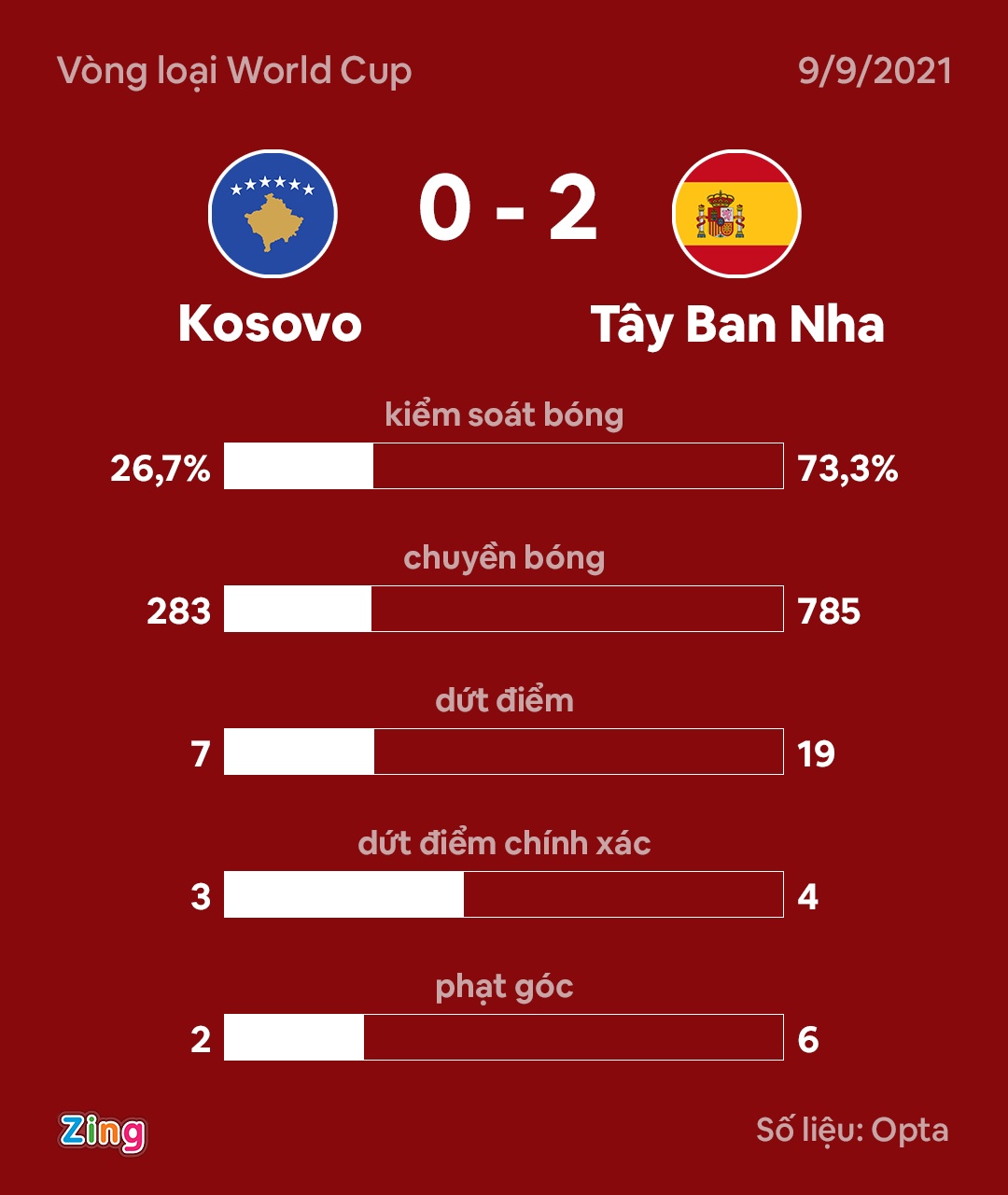 Kosovo, đội tuyển đang giữ hạng 115 FIFA, bị đánh giá thấp hơn hẳn. Tuy nhiên, họ chơi kiên cường, thậm chí có những phút dồn ép Tây Ban Nha và bỏ lỡ loạt cơ hội mười mươi trước khi thua đáng tiếc.