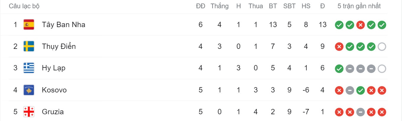 Lúc này, Tây Ban Nha dẫn đầu với 13 điểm sau 6 trận. "La Roja" hơn Thụy Điển 4 điểm nhưng chơi nhiều hơn 2 trận.