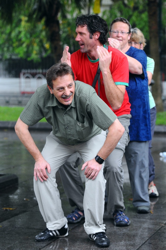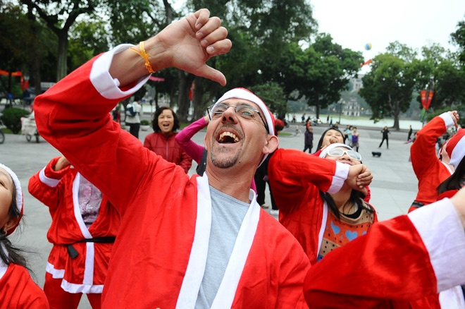 Anh Nick đến từ London (Anh) còn tham gia vào CLB Yoga cười dưới chân tượng đài Lý Thái Tổ vào 6h sáng.
