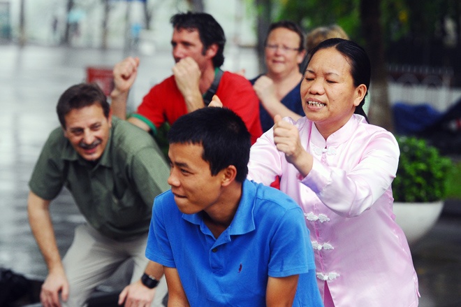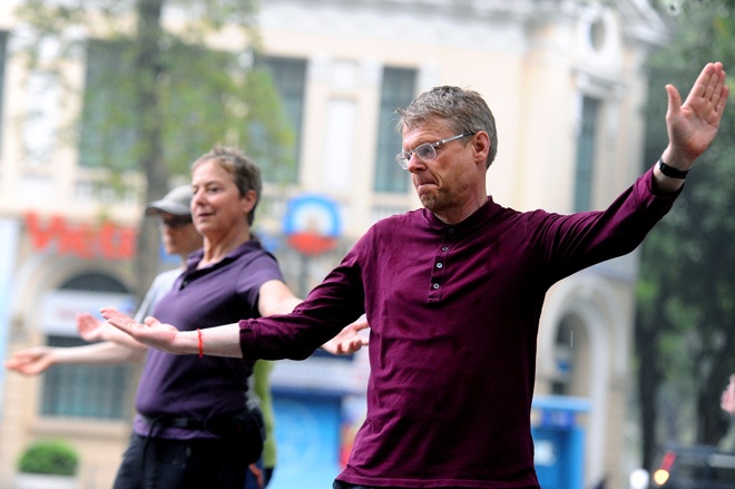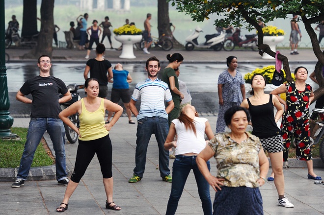 Phong trào thể dục buổi sáng ngày một phổ biến khiến những du khách nước ngoài ở Hà Nội cũng nhiệt tình tham gia các bài Thái cực quyền, yoga cười...
