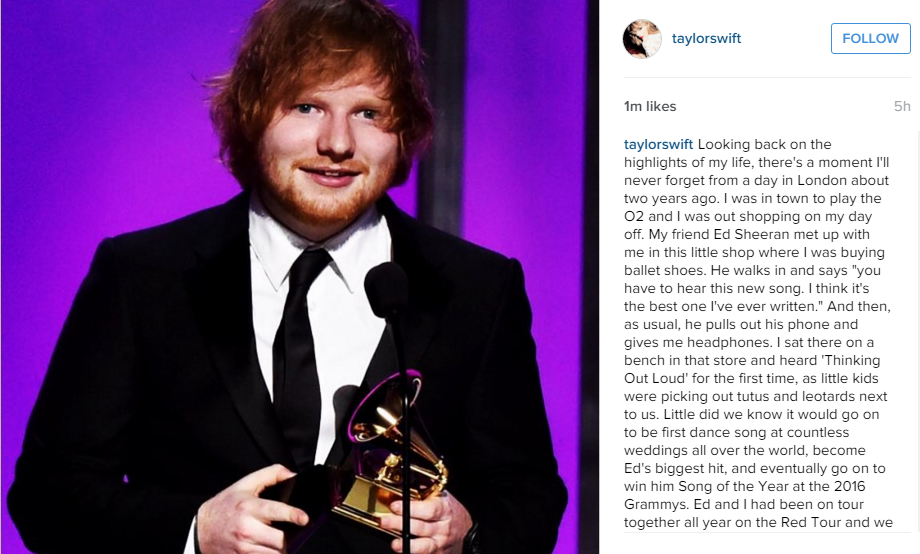 Và rồi dần dần sau đó, những gì chúng ta biết là nó trở thành ca khúc nhạc dance vang lên không biết bao nhiêu lần ở các đám cưới trên khắp thế giới, trở thành hit lớn nhất ủa Ed. Và cuối cùng, bài hát mang đến cho cậu ấy chiến thắng Ca khúc của năm tại Grammy 2016” – Taylor viết tiếp.