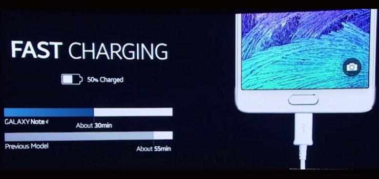 Máy được sử dụng mới màn hình cao cấp 2K mà Samsung đã đưa ra các thử nghiệm để chứng minh cho người sử dụng. Samsung Galaxy Note 4 lên tới 5 tiếng, sản phẩm thuộc vào nhóm pin tốt. Tổng thời gian sạc từ tới 90% khi đang mở màn hình mất từ 2 tiếng 30 phút, sạc nhanh khi tắt máy với thời gian là 2 tiếng. Samsung lưu ý khách hàng khi sử dụng sạc nhanh trong quá trình tắt máy nên kích hoạt chế độ sạc nhanh, nếu không sẽ bị vào tình trạng sạc chậm.