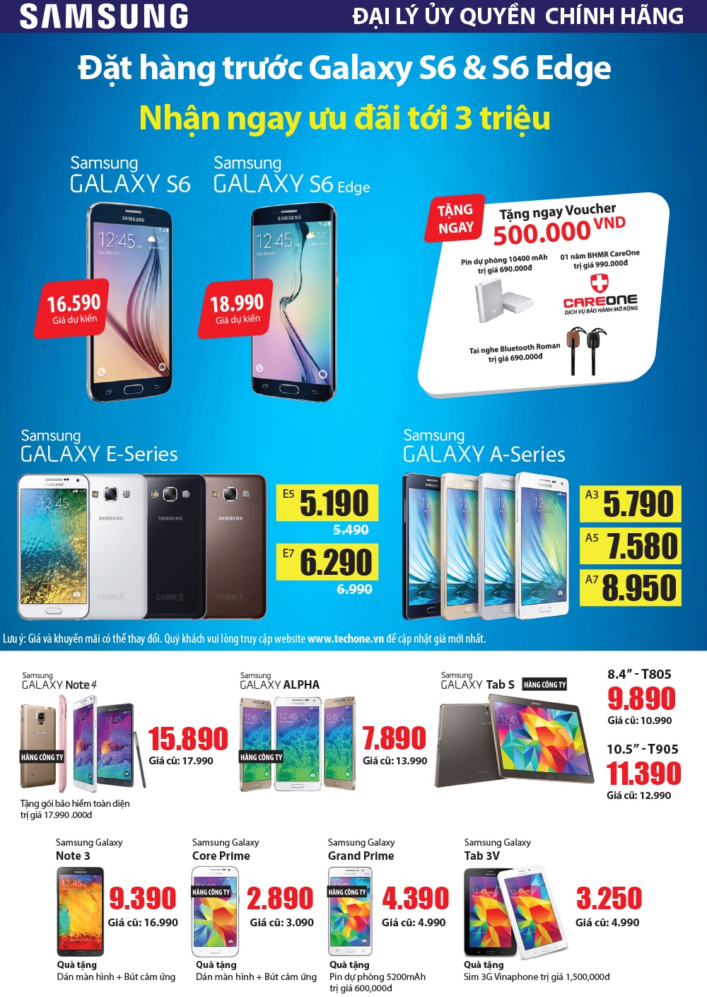 Samsung Galayx S6 và Samsung Galaxy S6 Edge: Nhận ưu đãi ngay tới 3 triệu đồng kèm gói bảo hành 24 tháng.