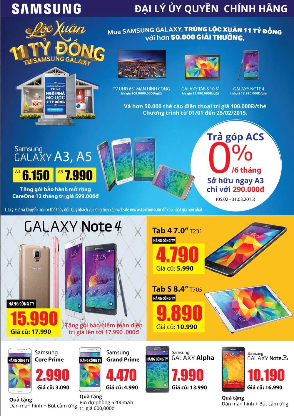 Không chỉ giảm giá mạnh Galaxy Alpha, từ nay đến 30/4, khi mua Note 4 và A series chính hãng tại TechOne, khách hàng sẽ nhận được nhiều ưu đãi lớn. Đây là chương trình hợp tác giữa Samsung Vietnam và TechOne - hệ thống siêu thị di động chính hãng uy tín hiện nay. Các ưu đãi cụ thể: