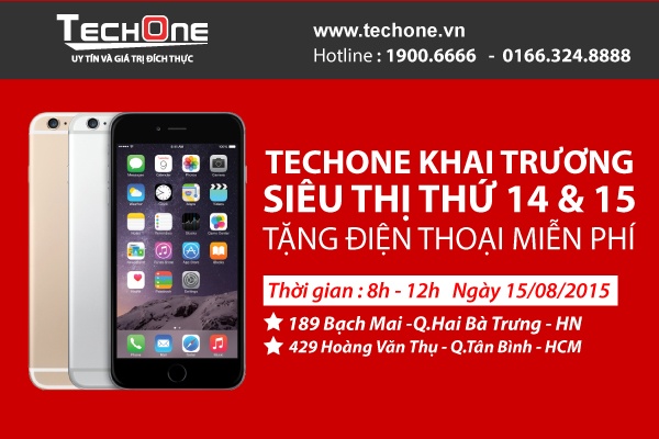 8h ngày 15/8, TechOne chính thức khai trương 2 siêu thị mới tại 189 Bạch Mai, Hà Nội và 429 Hoàng Văn Thụ, quận Tân Bình, TP HCM. Tại sự kiện, hệ thống gửi đến khách hàng nhiều chương trình khuyến mãi tặng điện thoại, phụ kiện miễn phí cho khách tham dự khai trương.