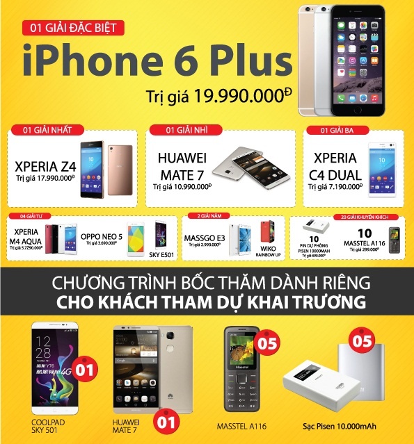 - 1 giải đặc biệt: iPhone 6 Plus 64 GB trị giá tới 19,99 triệu đồng