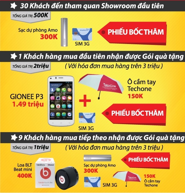Khách mua hàng đầu tiên trong ngày khai trương sẽ được nhận ngay phần quà trị giá tới 2 triệu đồng bao gồm điện thoại Gionee P3 trị giá 1,49 triệu đồng, một ô cầm tay TechOne sành điệu, sim 3G tài khoản 1,5 triệu đồng.