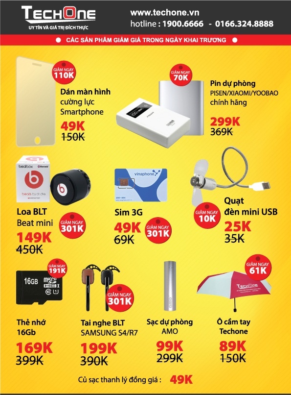 Trong cả ngày khai trương từ 8h đến 22h, khách đến mua hàng sẽ được giảm giá đặc biệt, hoàn tiền mặt từ 100.000 đồng đến 1 triệu đồng khi mua sắm điện thoại và phụ kiện tại TechOne 189 Bạch Mai và TechOne 429 Hoàng Văn Thụ.