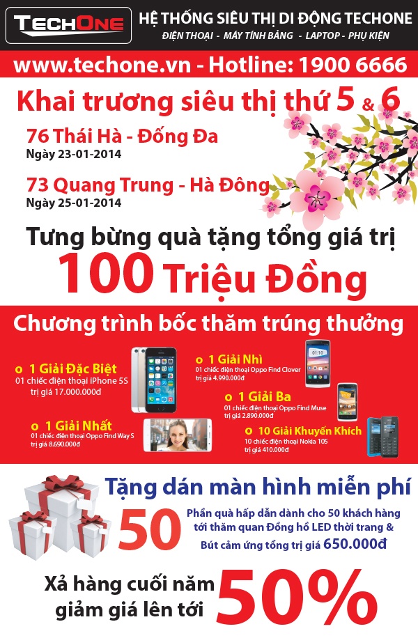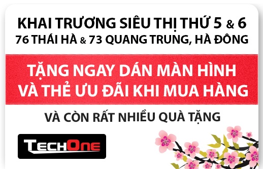 Trong 2 ngày khai trương 23 và 25/1, TechOne gửi tặng khách hàng 50 phần quà trị giá 750.000 đồng cho 50 khách hàng tham dự khai trương sớm nhất trong mỗi ngày khai trương, và đặc biệt nhất là khách hàng sẽ có hội nhận điện thoại OPPO và Nokia miễn phí khi tham gia chương trình Bốc thăm trúng thưởng.