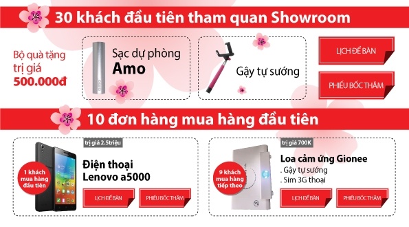 Trở thành khách hàng đầu tiên đến thăm quan showroom TechOne 106 Hồ Tùng Mậu, Cầu Giấy trong ngày khai trương 16/1, bạn sẽ có cơ hội nhận ngay phần quà trị giá 500.000 đồng bao gồm một sạc dự phòng Amo, một gậy chụp ảnh tự sướng, một lịch để bàn TechOne, một phiếu bốc thăm.