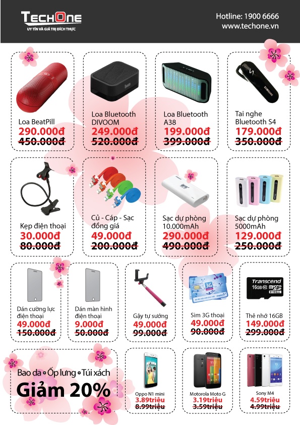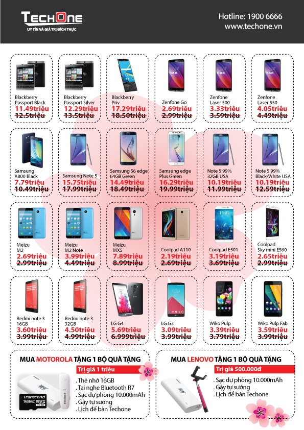 - 5 khách hàng đầu tiên mua Motorolar bất kỳ trong ngày khai trương sẽ được tặng thêm một bộ quà trị giá 1 triệu đồng bao gồm thẻ nhớ 16 GB trị giá 299.000 đồng; tai nghe Bluetooth R7 trị giá 300.000 đồng, một sạc dự phòng 10.000 mAh trị giá 390.000 đồng, một gậy chụp ảnh tự sướng trị giá 100.000 đồng, một lịch để bàn TechOne.