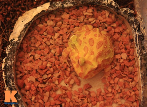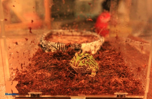 | Ếch Pacman có khả năng thích nghi khá cao. "Chăm sóc ếch cũng khá đơn giản; chỉ cần bể kính, mùn cưa ẩm và máng nước là đủ", Đức Anh - một người chơi cho biết. |