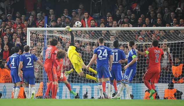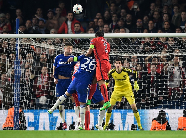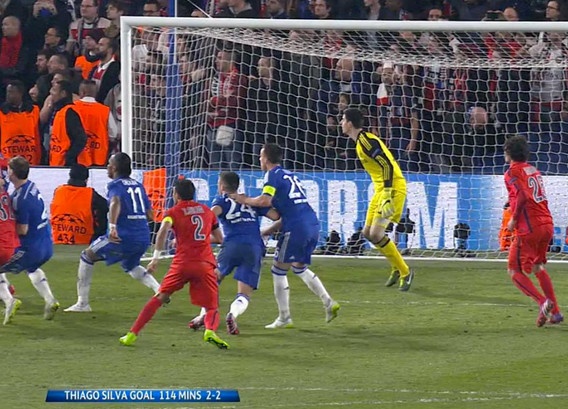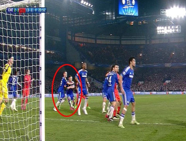 | Pha bóng diễn ra ở phút 114. Thay vì theo kèm đối phương, John Terry bất ngờ thực hiện động tác ngăn cản đồng đội Garry Cahill sau quả đá phạt góc bên cánh phải của PSG. |