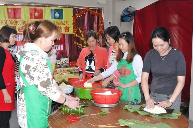 Tối 31/1, tại Trung tâm Hội trường Đông Viên trên đảo Hong Kong thuộc Đặc khu Hành chính Hong Kong, Trung Quốc, Tổng Lãnh sự quán Việt Nam tại Hong Kong và Macau đã tổ chức đón Tết Bính Thân 2016 cho cộng đồng người Việt tại Hong Kong và Macau. Phó Tổng Lãnh sự Việt Nam tại Hong Kong và Macau, bà Vũ Chi Mai (ngoài cùng bên phải) đã cùng bà con lao động Việt Nam tại Macau gói bánh chưng, bánh dày, bánh tét. Ảnh: VietnamPlus |