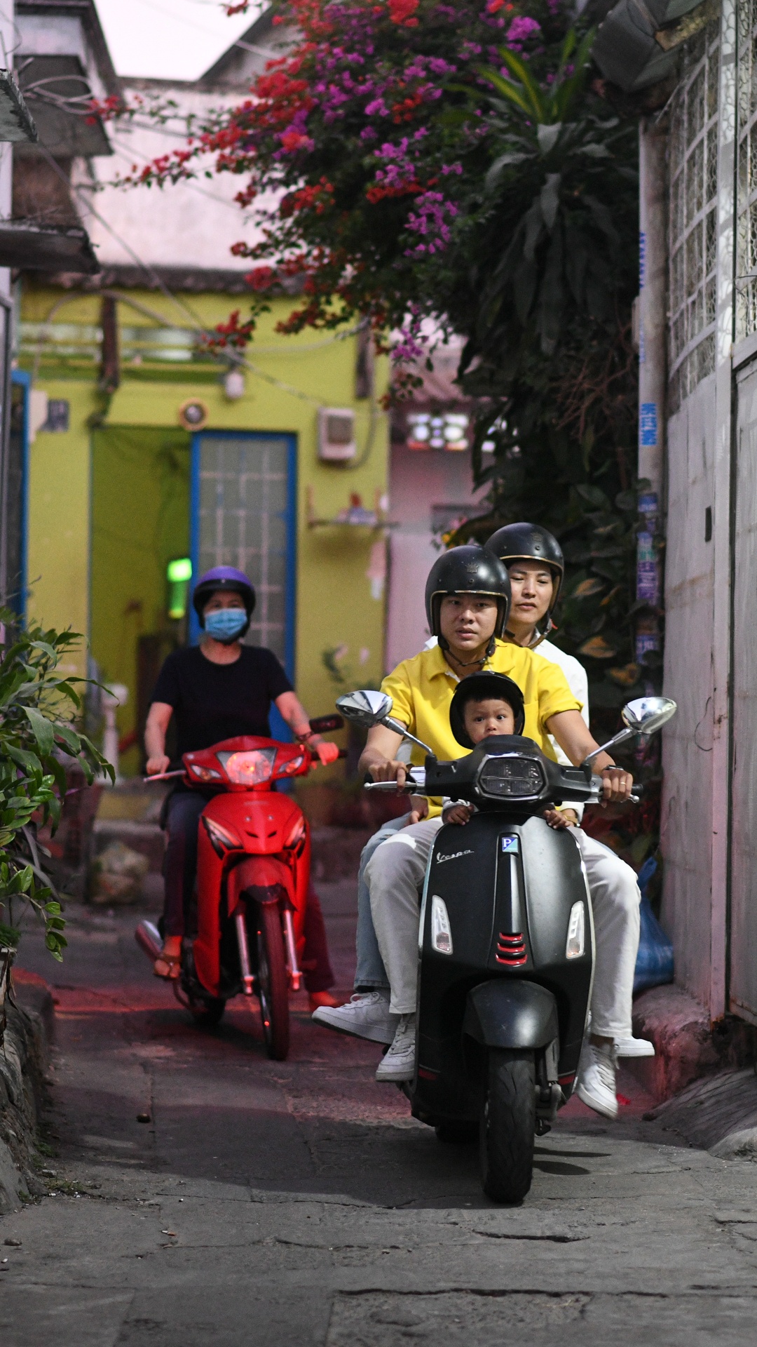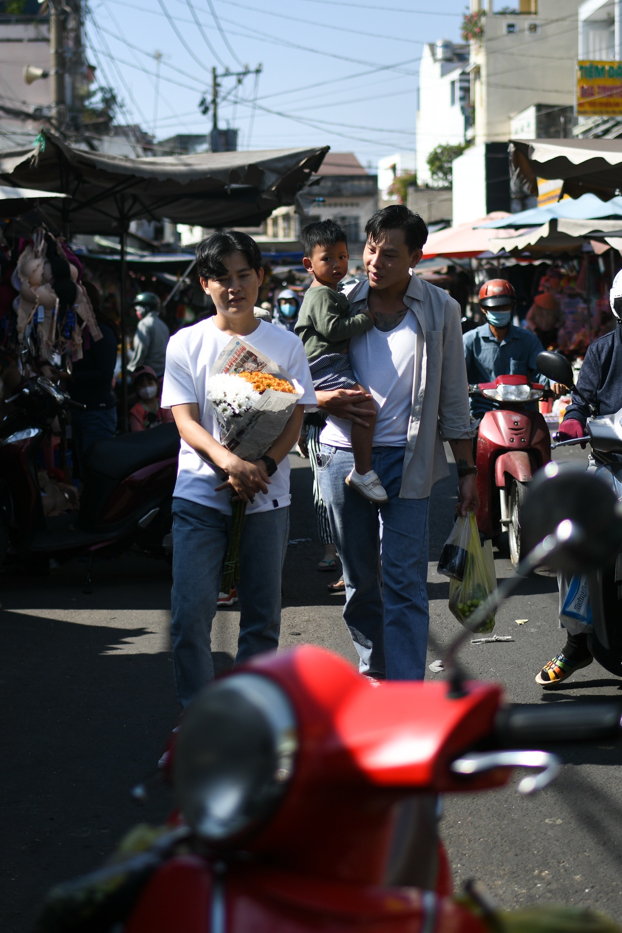 | Trước khi về nhà, cả gia đình ghé chợ mua hoa, thức ăn và ít trái cây. Chợ cách nhà khoảng 750 m nên chúng tôi có thói quen đi chợ theo ngày. Bình thường, ai trong hai người tan ca muộn hơn thì người còn lại sẽ đảm nhận việc đón con, đi chợ rồi về nhà cùng nấu ăn. |