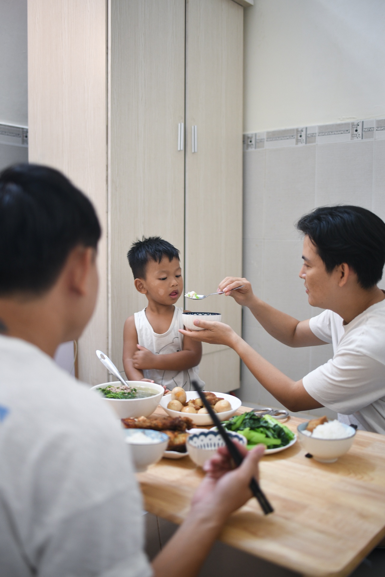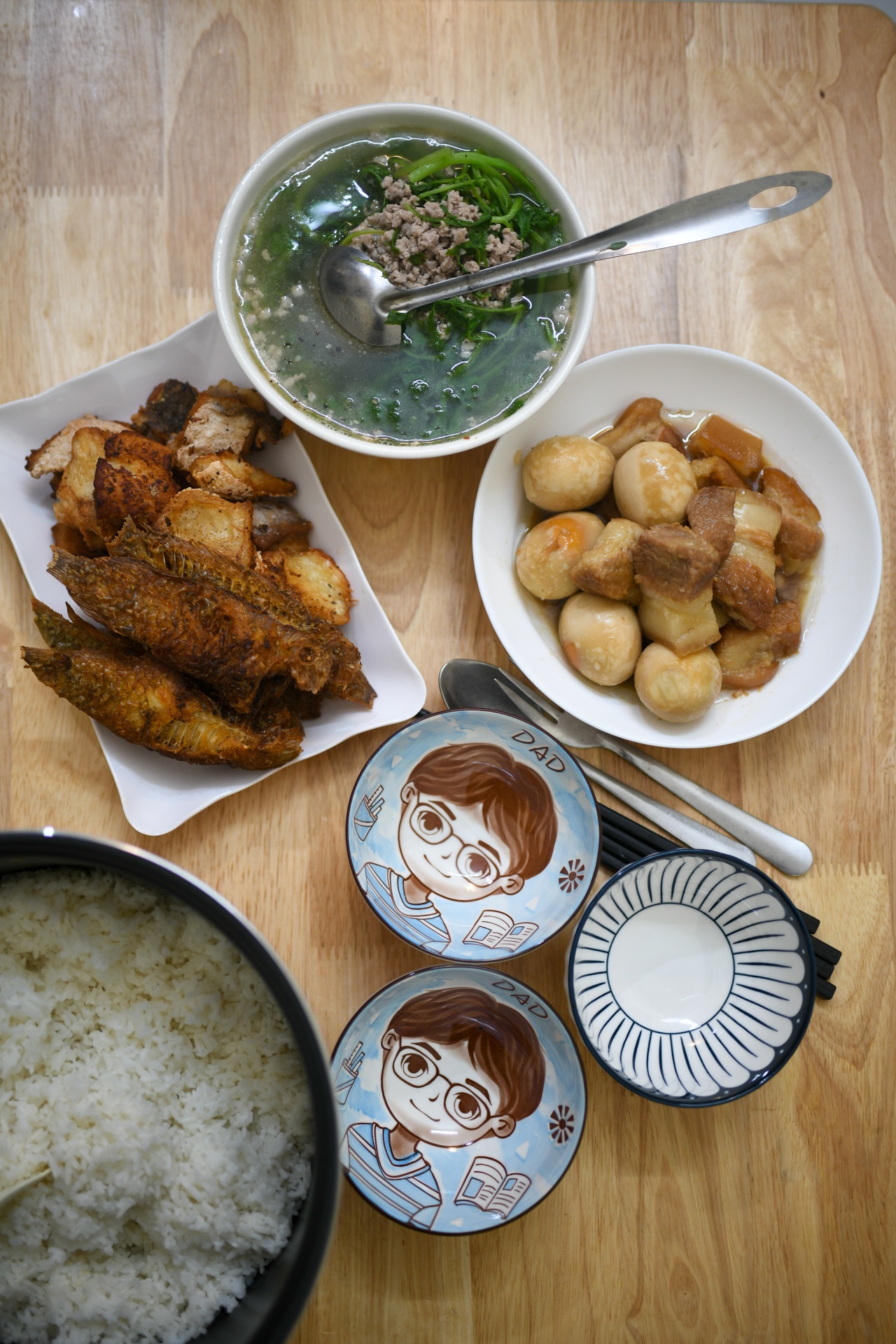 | Trong một lần gia đình đi mua sắm, Cọp chạy lại quầy bán đồ dùng nhà bếp, lấy ra hai chiếc bát có chữ “Dad” và đưa cho chúng tôi. Ban đầu, chúng tôi tưởng con nghịch ngợm nên toan trả lại cho cửa hàng. Nào ngờ, khoảnh khắc nhìn thấy hình vẽ rất dễ thương, phù hợp với câu chuyện của gia đình đã khiến chúng tôi quyết định mua chúng về nhà. Hai chiếc bát từ lâu đã không thể thiếu trong mâm cơm thường ngày của gia đình chúng tôi. |