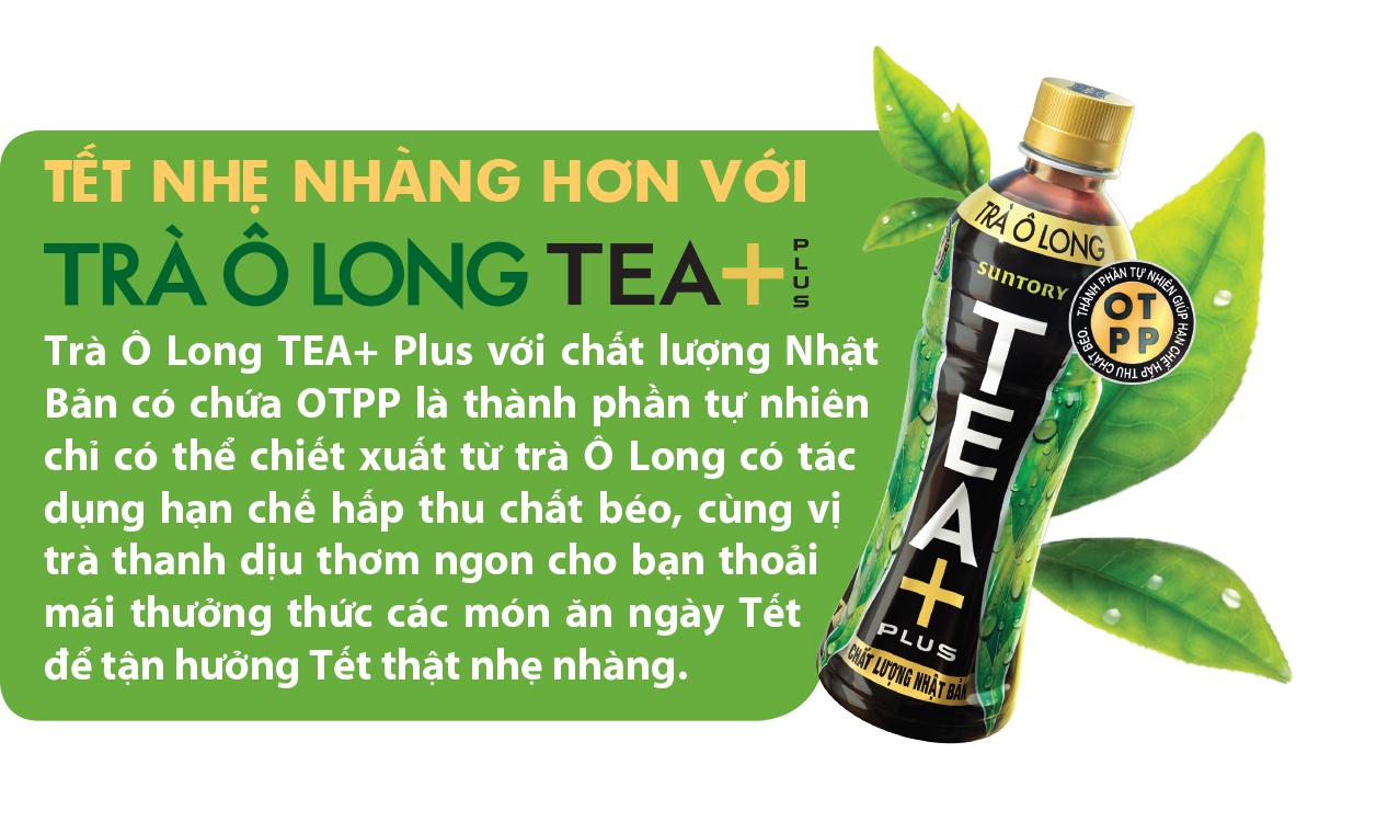 Tết nhẹ nhàng hay “nặng nề” cũng phụ thuộc vào những món ăn bạn lựa chọn. Thực đơn Tết của cả nhà có rất nhiều món ăn hấp dẫn mà mẹ chuẩn bị. Món chả giò, bánh chưng chiên, thịt kho hột vịt… trông ngon thật nhưng đôi lúc cũng ngại ăn nhiều, vì các món này hơi nhiều dầu mỡ. Nhưng Tết này mình đã có một bí quyết nhỏ giúp mình thoải mái thưởng thức món ngon ngày Tết, đó là trà Ô Long TEA+ Plus mát lạnh. Trà có chứa OTPP (Oolong Tea Polymerized Polyphenols) - là thành phần tự nhiên chỉ có thể chiết xuất từ trà giúp hạn chế hấp thu chất béo. Vậy là Tết này mình có thể thỏa thích thưởng thức các món ăn ngon do mẹ nấu mà không sợ ngấy rồi.