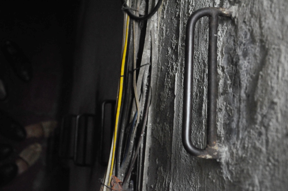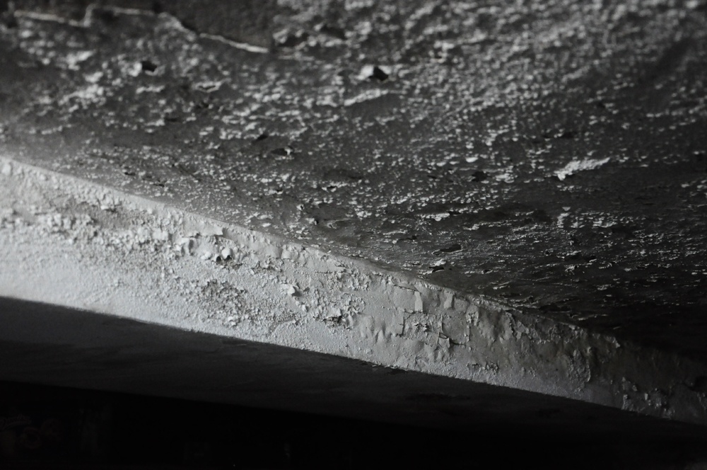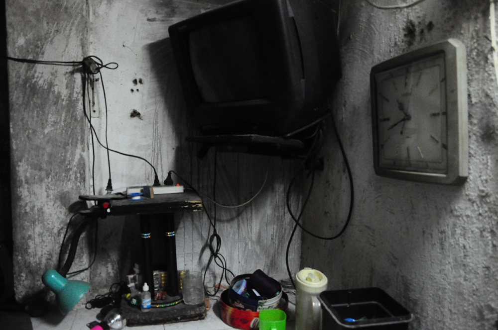 Những bức tường vôi tróc lở liên tục rơi bụi xuống sàn nhà anh Xuân. “Bên trên cũng có người ở, người ta đi lại mạnh chân, vôi vữa xây bao năm rồi nên dễ bục ra lắm. Không những thế bên trên người ta tắm rửa khiến nước thấm qua tường, gây ẩm mốc", anh Xuân nói.