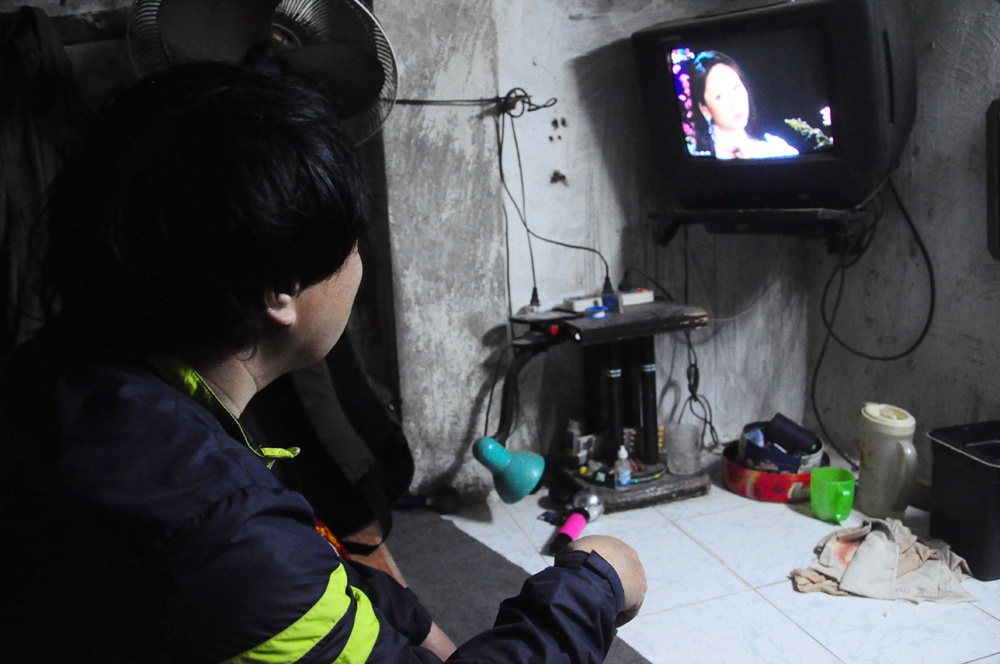 28 Tết, anh Xuân ở trong căn phòng bé ngồi xem ti vi và chờ có khách đi xe ôm.
