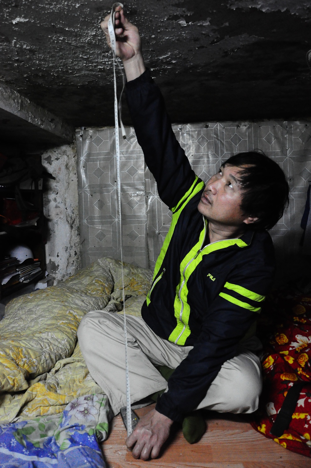 Căn nhà chỉ cao đúng gần bằng một sải tay của anh Xuân, dùng dây đo thực tế chỉ có 118cm.