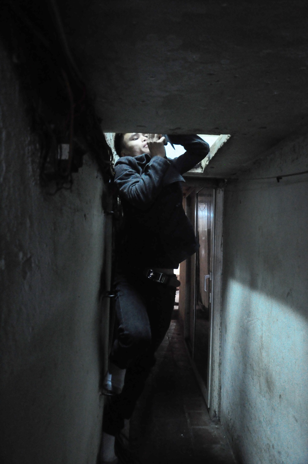 Lối lên xuống căn nhà "tí hon" của anh Xuân được đóng các chân sắt. Anh Xuân cho biết: '“Trước đây, hồi tôi chưa lấy vợ, chỗ ngủ cho cả 5 anh em trai trong nhà là nơi chỉ dài 3 mét và rộng 2 mét này đấy. Sau này lấy vợ thì hai vợ chồng tôi cùng đứa con trai ở. Đêm nằm ngủ muốn cựa quậy cũng khó, chật vật không yên giấc".
