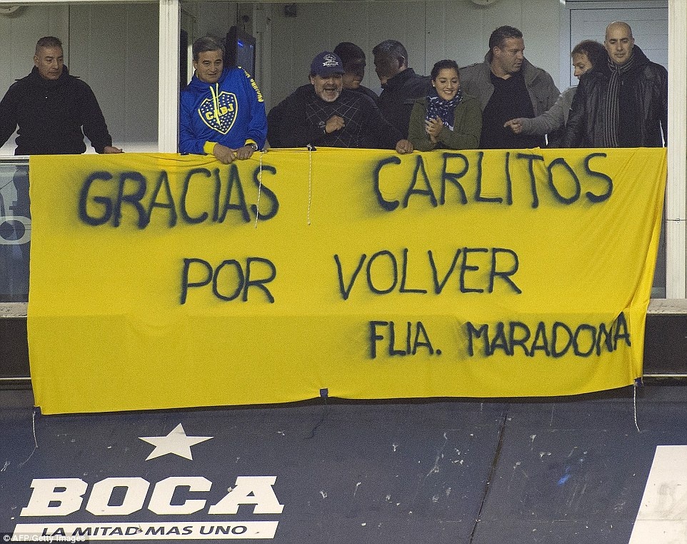 | Huyền thoại Diego Maradona (đội mũ) cũng có mặt tại sân La Bombonera để chào đón sự trở lại của Carlos Tevez. Trong sự nghiệp cầu thủ, "Cậu bé vàng" từng khoác áo Boca Juniors. Nhà vô địch World Cup 1986 cũng chọn CLB này làm điểm dừng chân cuối cùng trước khi treo giày. |