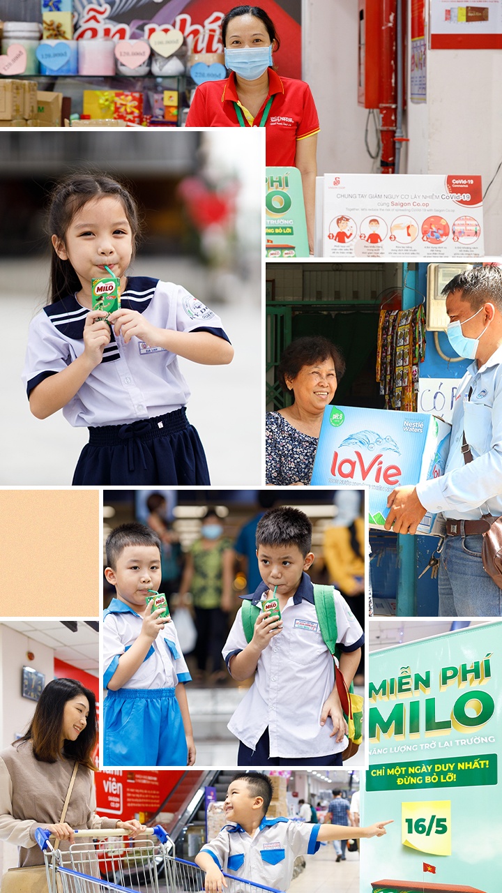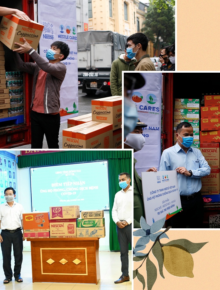 Hiện thực hoá mục tiêu này, tập đoàn hỗ trợ tuyến đầu chống dịch với sản phẩm của mình, khẩu trang y tế trị giá 12 tỷ đồng. Nestlé cũng phát động chương trình “luôn khỏe luôn tích cực”, khuyến khích cộng đồng địa phương áp dụng thói quen thích cực và lối sống lành mạnh. Hãng nỗ lực tương tác với người tiêu dùng thông qua các hoạt động, sáng kiến khác nhau. Điển hình, nhãn Milo với chương trình “Ở nhà nhưng đừng ở yên” truyền năng lượng, hứng khởi đến trẻ nhỏ tập luyện thể thao tại nhà qua các video hướng dẫn vovinam và thể dục nhịp điệu. Maggi lại giới thiệu nhiều công thức nấu ăn ngon miệng, tốt cho sức khỏe qua “Cơm nhà ngon khỏe”. Với chương trình “Trở thành Barista tại nhà”, Nescafé góp phần biến thời gian giãn cách xã hội thành những khoảnh khắc thú vị. Milo tiếp năng lượng cho trẻ quay lại trường học với 2 triệu hộp phát miễn phí.
