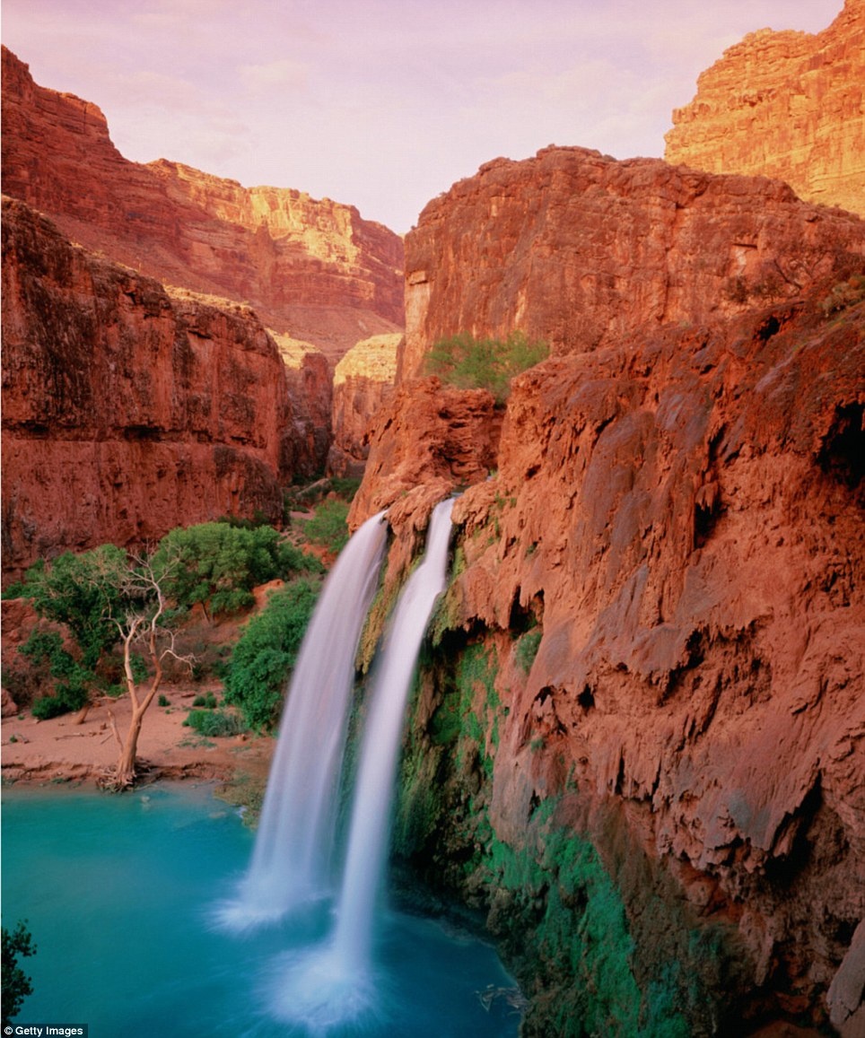 Thác nước Havasu chảy thành hai dòng khi đổ xuống hồ nước phía dưới. Nguồn nước ngọt của dòng thác phủ xanh lớp đất đá sẫm màu của hẻm núi vĩ đại nhất hành tinh. |