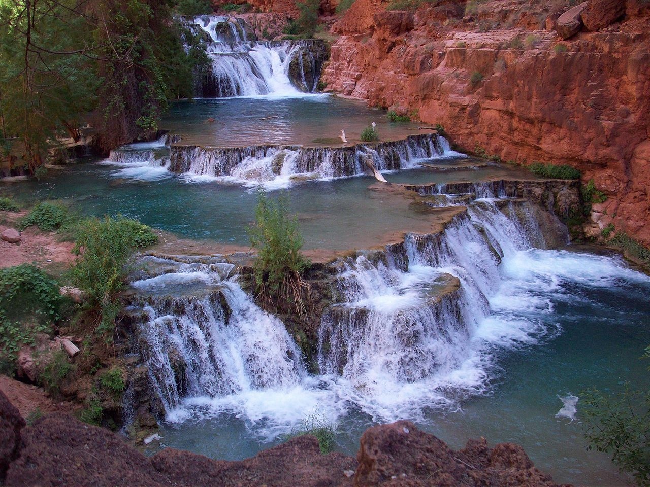 Dòng nước trong xanh của thác nổi bật giữa màu đất đá đặc trưng của Grand Canyon. Đây là thác nước ăn hình nhất hẻm núi này. Thác nước tạo ra tiếng gầm như sấm do các vách đá quây xung quanh tạo ra hiện tượng dội âm. |
