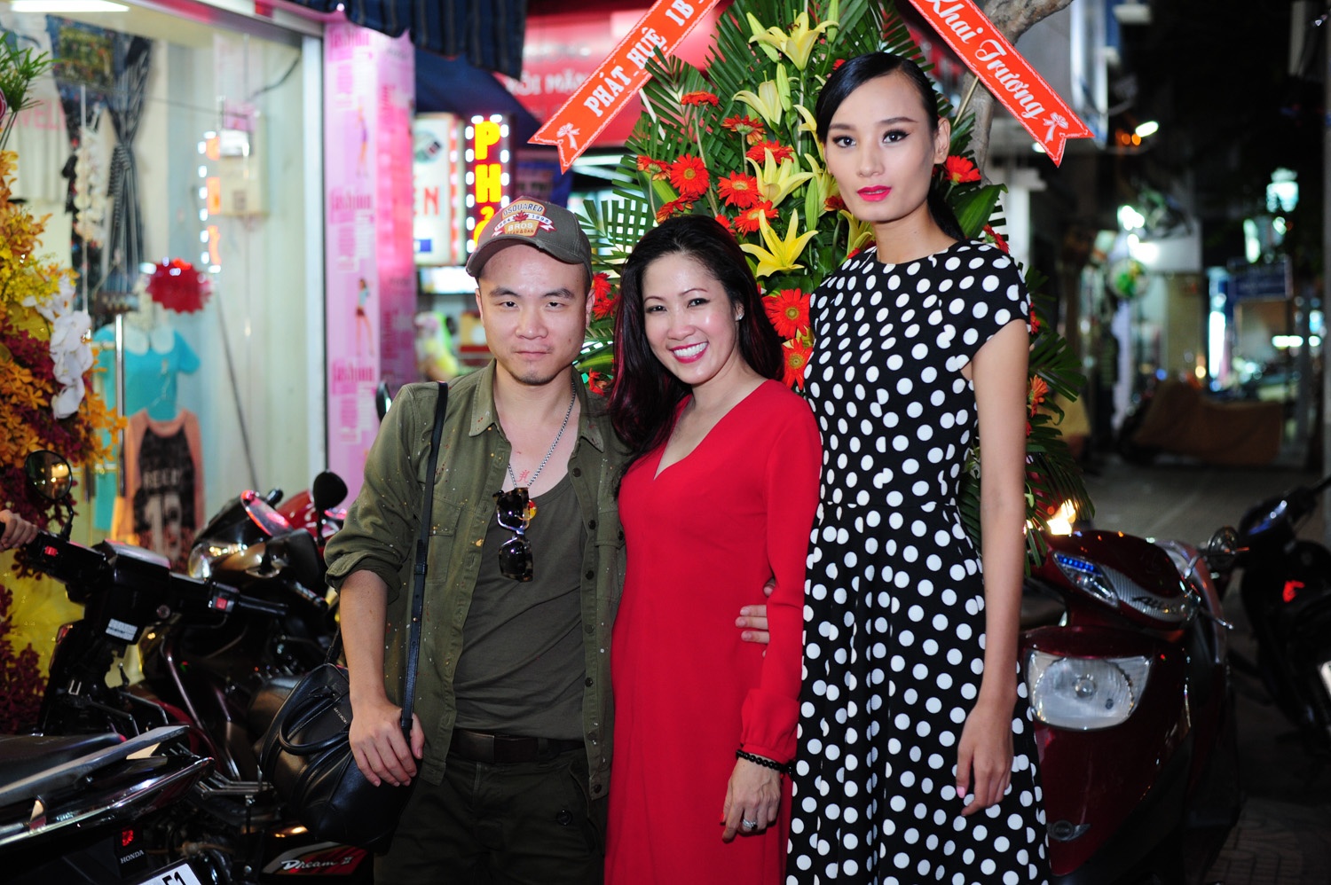 Chân dài Lê Thuý được Đỗ Mạnh Cường tháp tùng đi dự sự kiện. Thầy trò nhà thiết kế chụp ảnh cùng Hạ My.