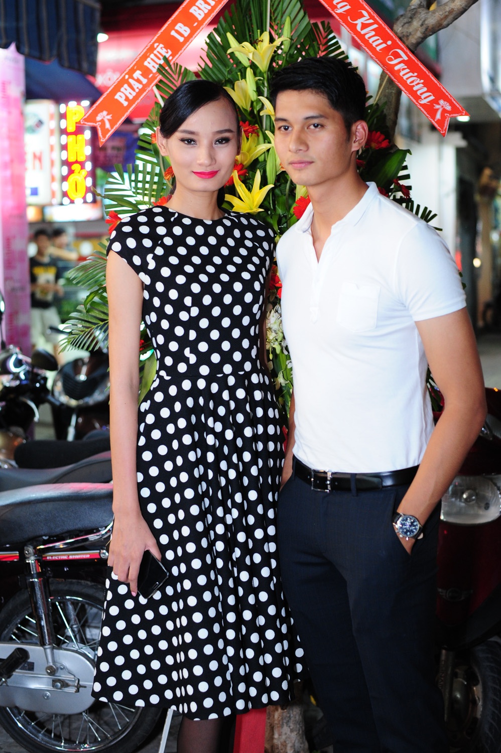 | Cô khoe dáng bên cạnh nam người mẫu Văn Kiên. |