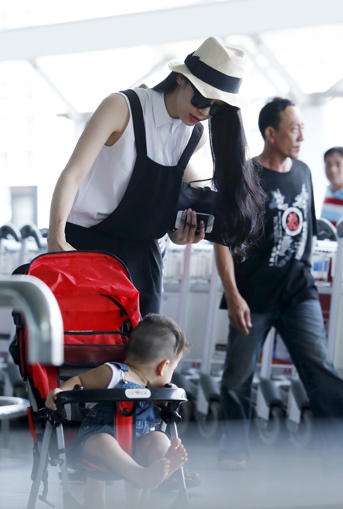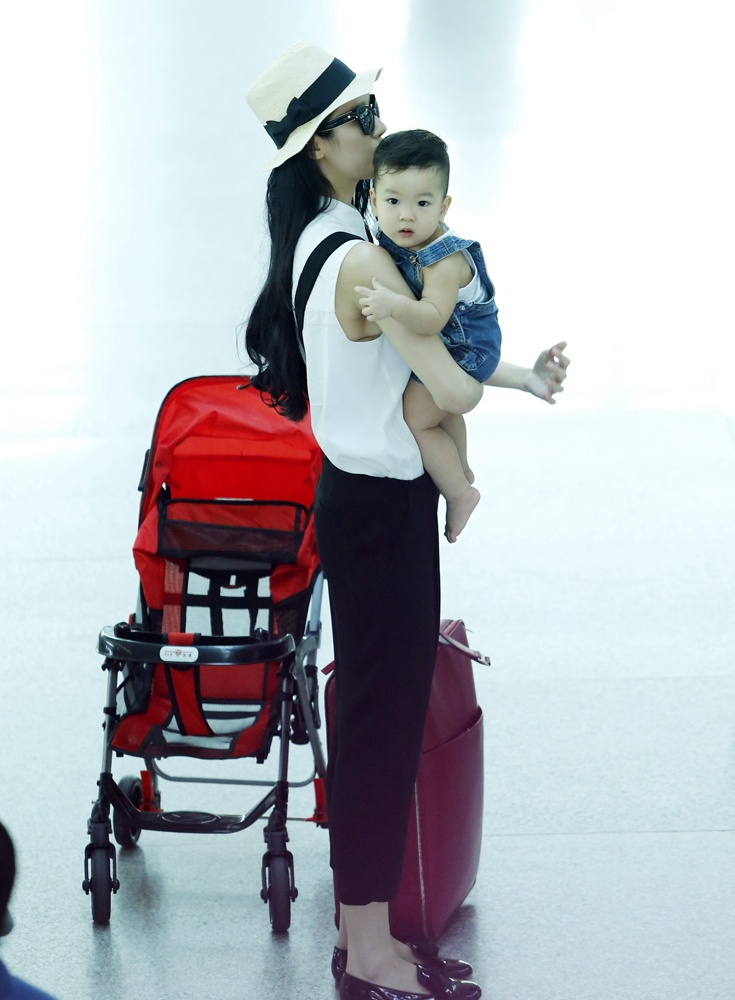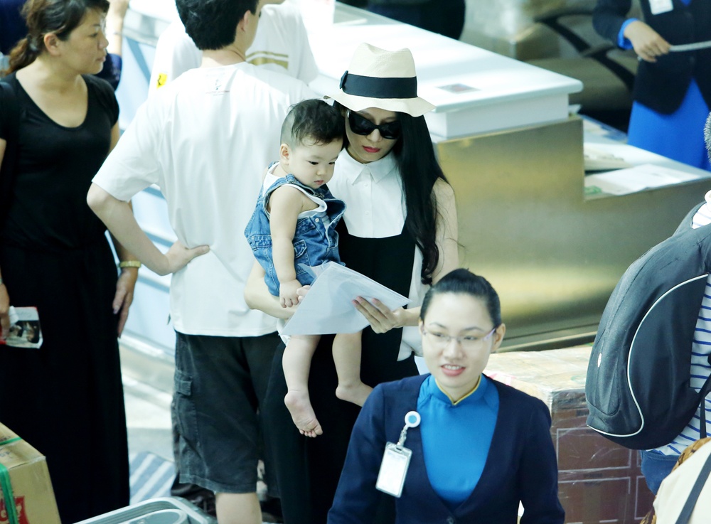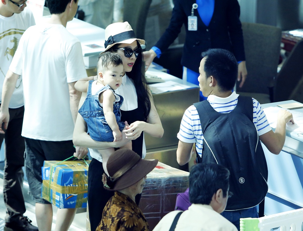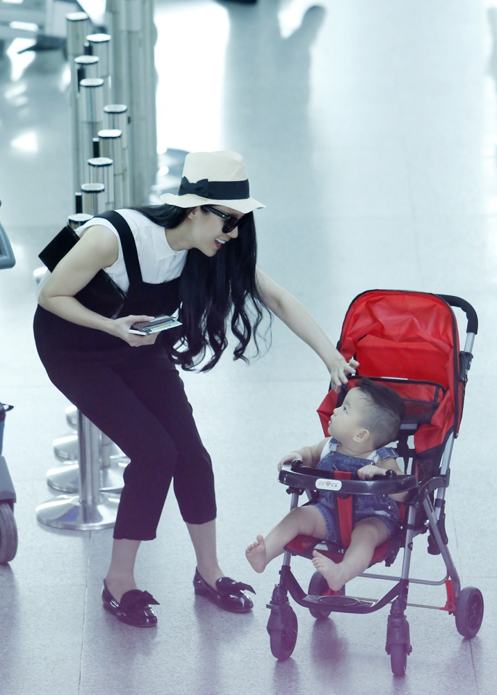 | Ở sân bay, Thái Hà chăm chút rất chu đáo cho con trai. Còn bé Sâu tỏ ra ngoan ngoãn khi ngồi trong chiếc xe đẩy và chờ mẹ xếp hàng làm thủ tục. |