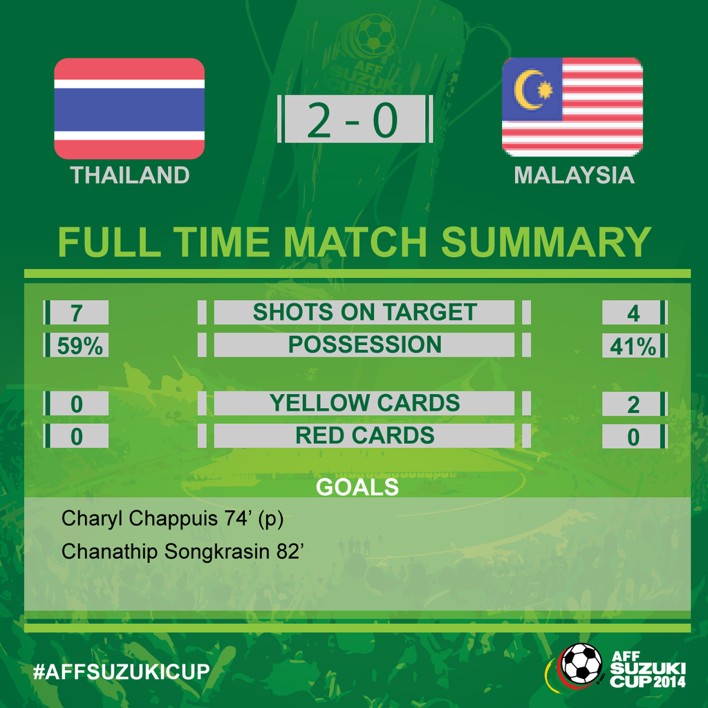 Phút 70, Kraisorn đem về cho Thái Lan một quả phạt penalty khi buộc hậu vệ Malaysia phạm lỗi trong vòng cấm. Trên chấm 11 m, Chappuis dứt điểm quyết đoán khai thông bế tắc cho đội nhà. Trong tình huống này các trọng tài đã bị qua mặt bởi pha quay chậm cho thấy Kraisorn đã chủ động ngã ăn vạ.