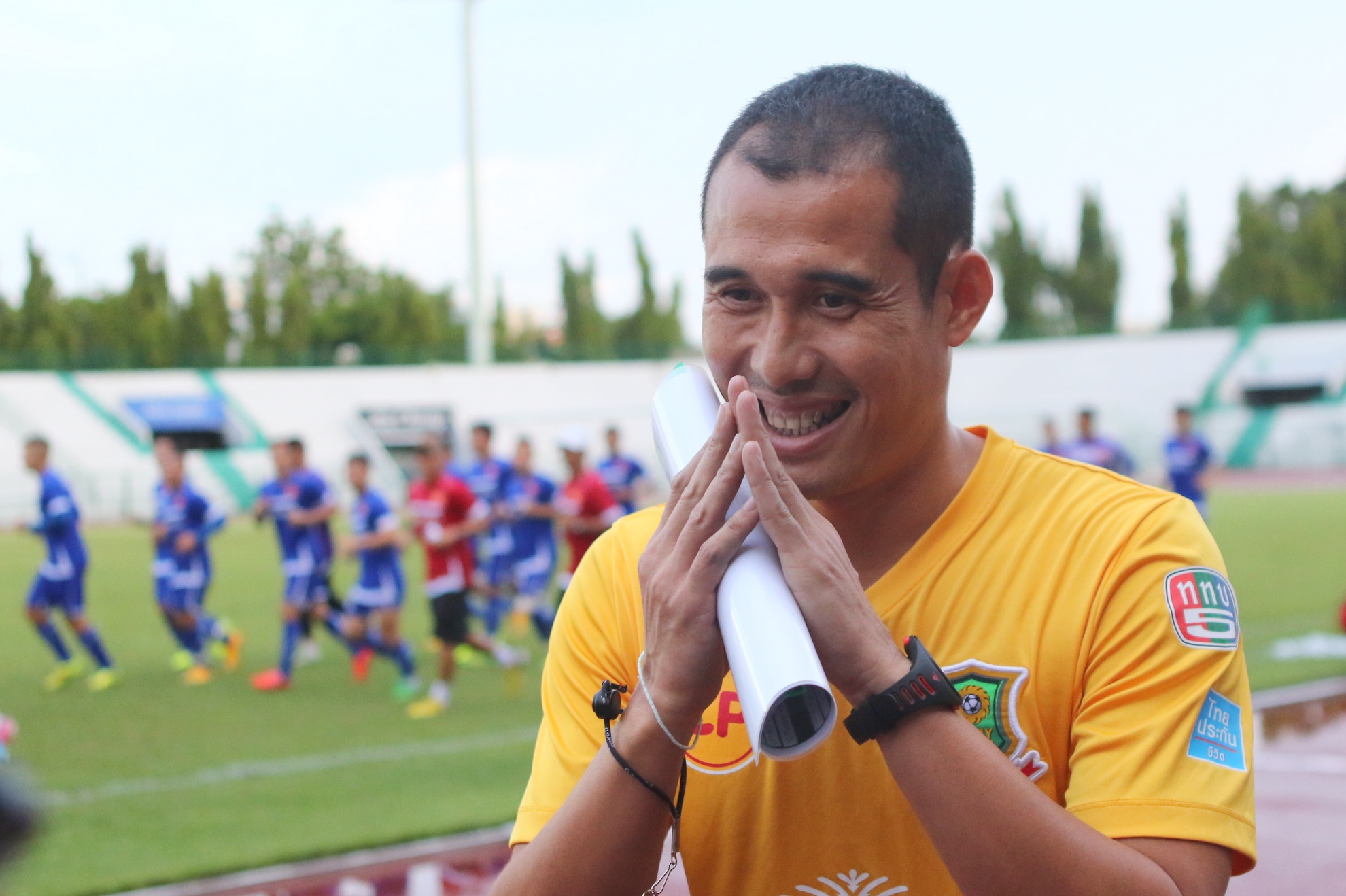 | Đoàn Văn Nirut quan sát buổi tập của ĐT Việt Nam tại Thái Lan. Anh là bạn thân với HLV trưởng ĐT Thái Lan - Kiatisak Senamuang. |