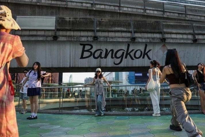 Du khách Trung Quốc chụp ảnh trên cầu vượt ở Bangkok năm 2024. Ảnh: Reuters. |