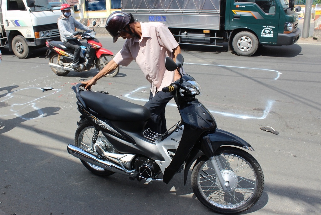 | Cú tông bất ngờ từ phía sau khiến chị Tươi văng xuống đường rồi bị xe ben cán qua người, kéo lê một đoạn gần 5 m mới dừng lại khiến chị bị thương nặng. Ông Linh chỉ bị thương nhẹ nhưng rất hoảng loạn. |