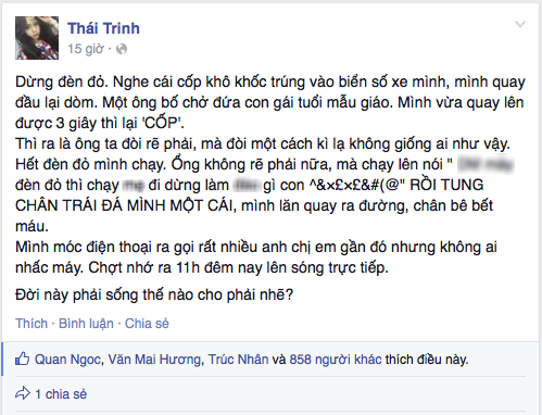 Bức xúc trước hành động vô văn hoá, thiếu lịch sự của người cùng tham gia giao thông, Thái Trinh viết: "Đời này phải sống thế nào cho phải nhẽ?".