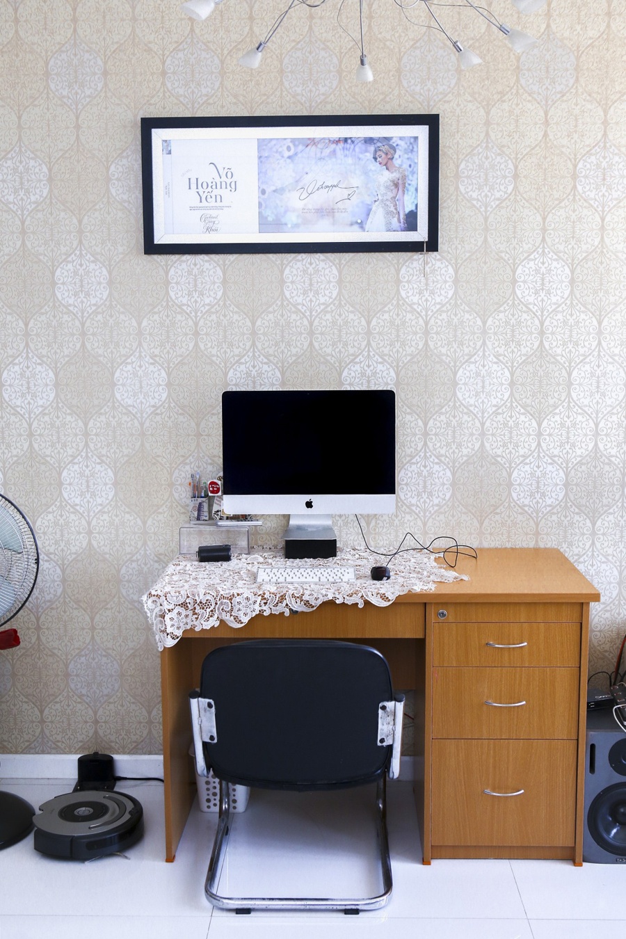 | Góc làm việc khá đơn giản của Hoàng Yến. Phía trên có hình ảnh của gia chủ, được lồng cẩn thận trong khung. Tường nhà được dán giấy cẩn thận, theo phong cách cổ điển của những thập niên trước. |
