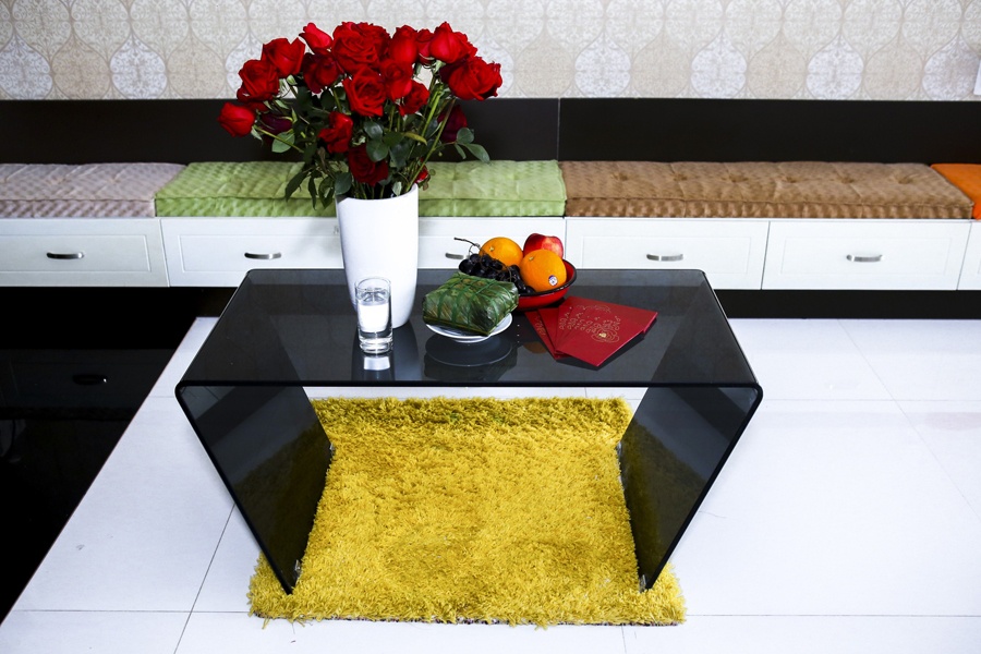| Một góc bàn khách khá gọn gàng, là nơi trưng bày hoa và những món ăn đặc trưng ngày Tết. |