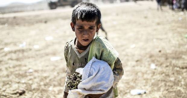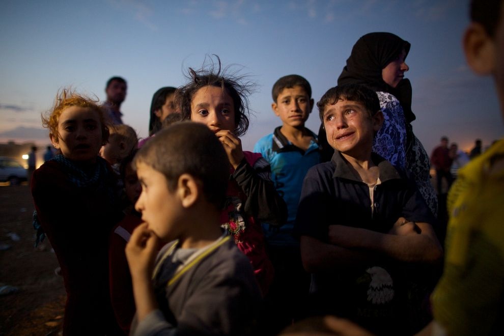 Cậu bé Ahmed, 5 tuổi, khóc vì sợ hãi dù đã đặt chân lên đất Thổ Nhĩ Kỳ. Cùng với hơn 60.000 người khác, gia đình cậu buộc phải rời bỏ quê hương để bảo toàn tính mạng trước đà tiến công của IS. |