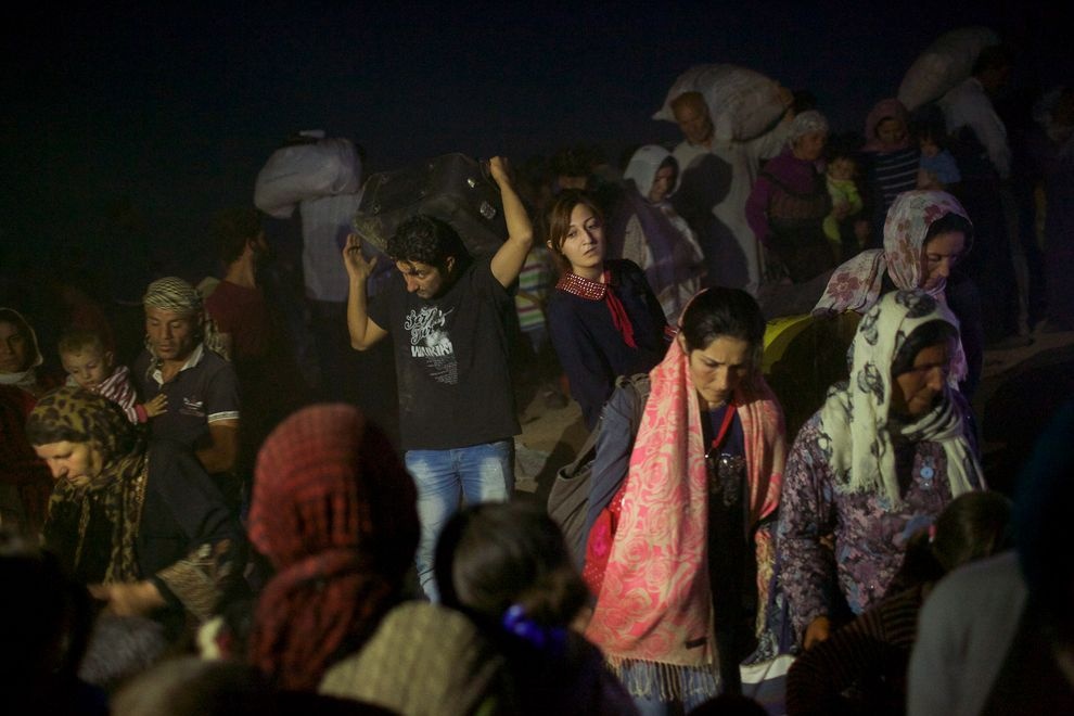 Đoàn người chạy nạn lầm lũi di chuyển trong đêm tối với đồ đạc lỉnh kỉnh. Hàng ngàn người Syria ở khu vực Kobani đã tới Thổ Nhĩ Kỳ tối ngày 19/9. Lực lượng biên phòng Thổ Nhĩ Kỳ cắt hàng rào bao quanh biên giới để họ tiến vào. Ảnh: National Geographic |
