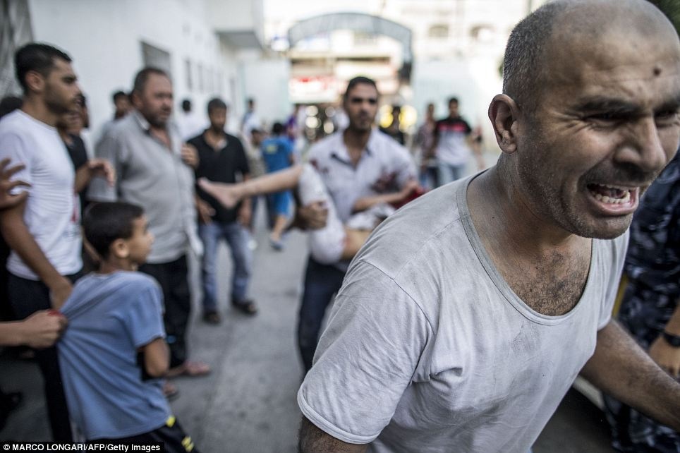 Bố nạn nhân gào thét, yêu cầu mọi người tránh đường để đưa con gái tới bệnh viện. Cô bé tội nghiệp bị thương khi đang chơi gần nhà. Ảnh: AFP |