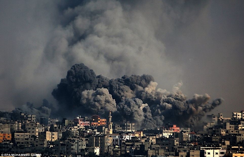 Một quả bom khiến khu vực rộng lớn ở Al Shejaeiya chìm trong khói, bụi. Ảnh: EPA |