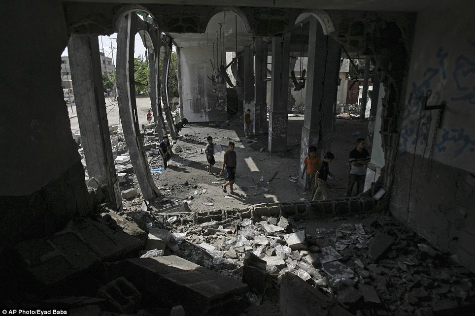 Trẻ em chơi đùa trong những ngôi nhà sắp sập. Ảnh: AP |