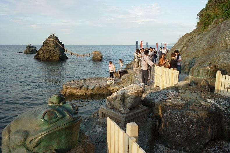 | Ngay bên cạnh chỗ hai tảng đá Meoto Iwa là ngôi đền Futami Okitama cũng là một địa điểm tôn kính quan trọng không kém. Xung quanh ngôi đền có vô số tác phẩm điêu khắc hình những chú ếch và những tín đồ cầu nguyện cho người mình yêu trở về một cách an toàn. |