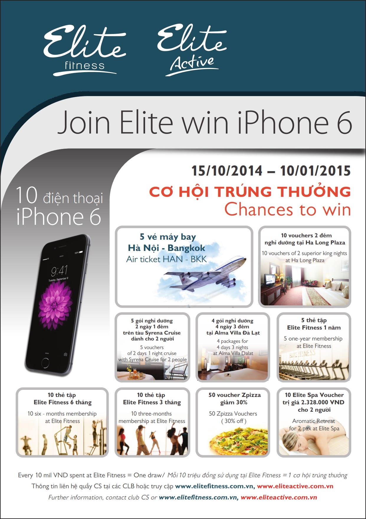 Theo đó, mỗi 10 triệu đồng sử dụng tại Elite Fitness tương ứng với 1 cơ hội trúng thưởng, ngoài 10 điện thoại iPhone 6, hội viên sẽ được nhận nhiều quyền lợi rất lớn: vé máy bay Hà Nội - Bangkok, vouchers nghỉ dưỡng tại Hạ Long Plaza, Alma Villa Đà Lạt, thẻ tập tại hệ thống Elite Fitness, voucher thưởng thức đồ ăn tại Zpizza, hay tận hưởng các dịch vụ tuyệt vời tại Elite Spa... vô cùng hấp dẫn.