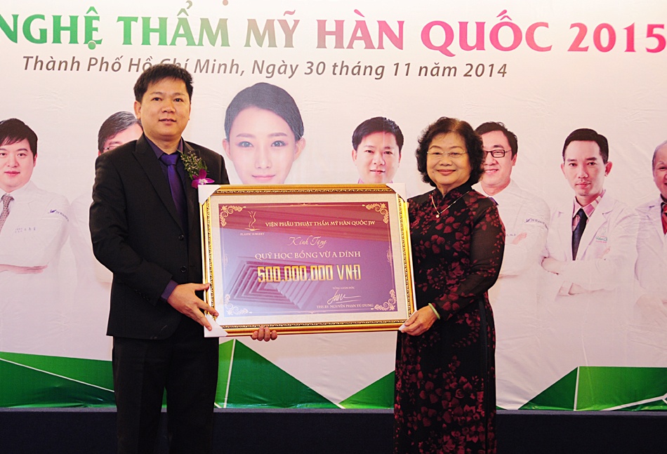 Sau đó, MC công bố thẩm mỹ viện JW sẽ tổ chức trao tặng 6 xuất học bổng cho sinh viên y khoa trị giá 500 triệu đồng cho bà Trương Mỹ Hoa - chủ tịch quỹ Vừ A Dính (quỹ từ thiện dành cho những học sinh, sinh viên các dân tộc thiểu số). ThS.BS Nguyễn Phan Tú Dung đại diện cho Thẩm mỹ viện JW cho biết: "Chúng tôi hy vọng sẽ góp chút sức lực nhỏ bé của mình vào việc chắp cánh ước mơ cho những bạn sinh viên khó khăn thực hiện đến cùng niềm đam mê của mình".